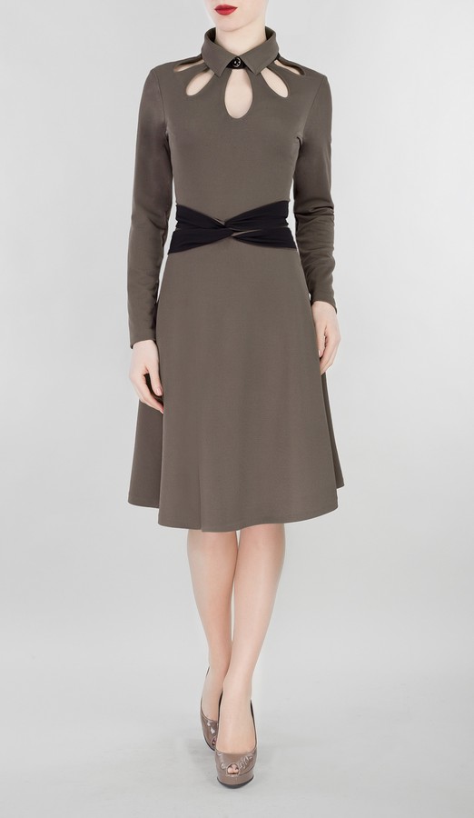 Очаровательное платье из мягкого и приятного на ощупь трикотажа. Горловина изделия оформлена аккуратным невысоком воротником-стойкой контрастного цвета с застёжкой на пуговицу. Основное внимание в моделе привлекает область горловины и декольте, которая украшена вырезами - "капельками". Дополнительной приталенности придают изящные выточки по груди и средний шов по спинке. Гармонично дополняет платье "Аура" двухцветный пояс, оригинально фиксирующийся, и выигрышно подчеркивающий линию талии. Длина модели от линии талии изменяется соответственно по размерам: 46, - 57 см; 50, 52,- 59 см.