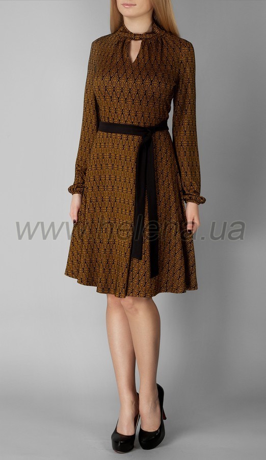 Платье имеет полуприлегающий воротник-"стойка", впереди оригинально присобранный, и плавно переходящий в кокетливый вырез, а по спинке застёгивается на пуговицы. Кокетливая деталь спинки - аккуратный разрез по центру верха. Длинный рукав присобран по низу на мягкую резинку. Линия талии специально выделяется тонким поясом. Дополнительной привлекательности платью Шейла придаёт расклешённый от линии талии силуэт. Длина изделия от линии талии изменяется соответственно по размерам: 44, 46, 48, 50 - 59 см; 52, 54 - 61 см. Название цвета по коду: 759-1 - бордо, синий 759-2 - оранж, чёрный 759-3 - красный, чёрный 759-4 - горчичный ромб 759-5 - красный ромб