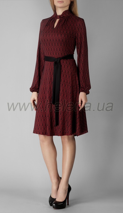 Платье имеет полуприлегающий воротник-"стойка", впереди оригинально присобранный, и плавно переходящий в кокетливый вырез, а по спинке застёгивается на пуговицы. Кокетливая деталь спинки - аккуратный разрез по центру верха. Длинный рукав присобран по низу на мягкую резинку. Линия талии специально выделяется тонким поясом. Дополнительной привлекательности платью Шейла придаёт расклешённый от линии талии силуэт. Длина изделия от линии талии изменяется соответственно по размерам: 44, 46, 48, 50 - 59 см; 52, 54 - 61 см. Название цвета по коду: 759-1 - бордо, синий 759-2 - оранж, чёрный 759-3 - красный, чёрный 759-4 - горчичный ромб 759-5 - красный ромб