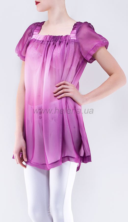 Невероятно лёгкая и "воздушная" туника свободного силуэта из полупрозрачного материала. Вырез горловины оформлен квадратной формой "карэ", со слегка присобранными планками, соблазнительно открывающей область шеи. Рукав - короткий, аккуратно присобранный по низу. Туника "Парфе", выполненная в романтическом стиле, придаст женскому образу нежности и дополнительной женственности.