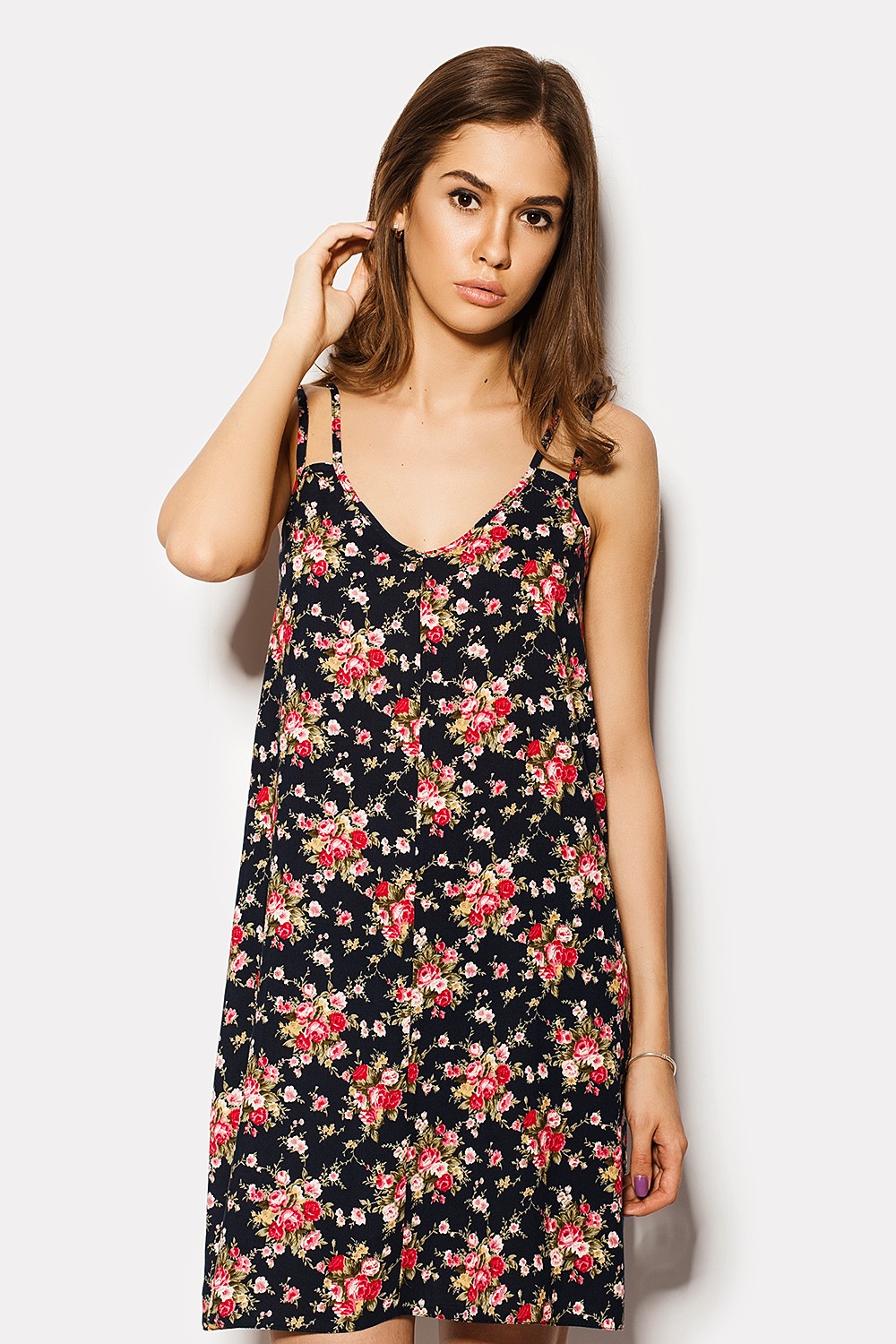 Классического фасона для летнего платья не существует. Невозможно предугадать какими будут новые тенденции и стили. Но сейчас, после большого количества модных показов, можно уверенно заявить, что одной из таких тенденций станет легкий материал штапель. Платье ALLEGORIA, пошитое из штапеля, вселяет чувство уверенности и стильности. Темно синий цвет полотна украшают мелкие букетики цветов. Они разбросаны по всей поверхности платья и просматриваются даже на тонких бретелях. Одна полоса бретель удерживает платье по плечу, вторая удерживает ткань и переходит на V-образный вырез.