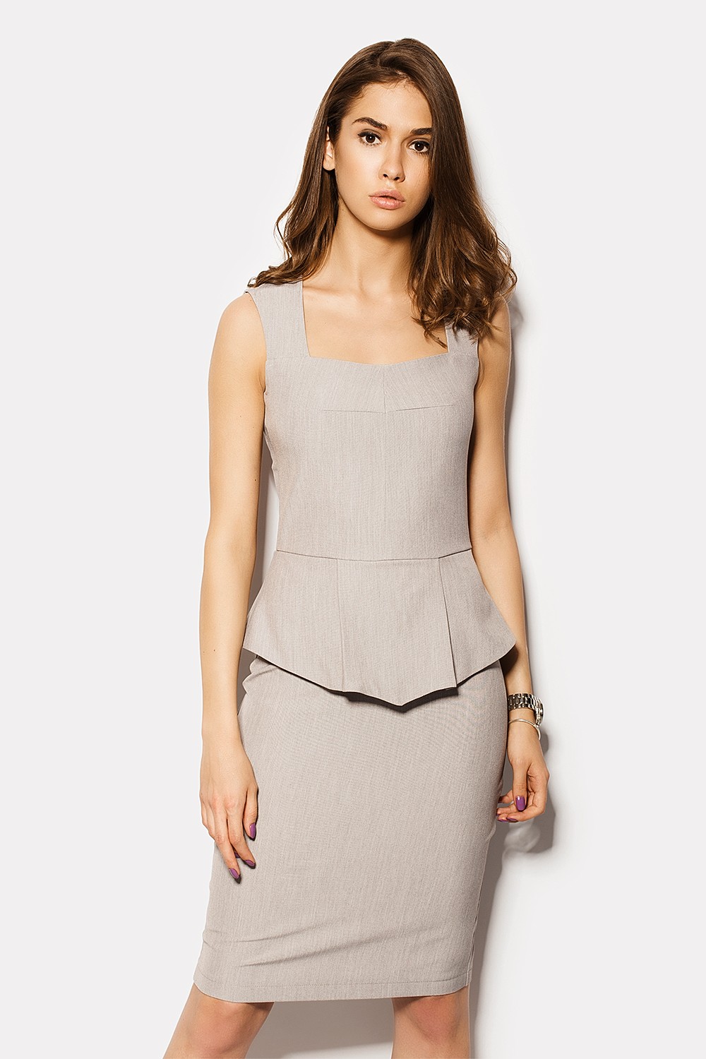 Костюмная ткань не обязательно должна использоваться для брюк, юбки или пиджака. Свойства такой ткани позволяют смело пошить из нее платье BETANI. Деловой фасон этого платья с визуальным разделением на юбку и топ делает универсальный вид одежды поистине красивым. На груди топа вырез каре, на спинке скрытая молния. От талии идет баска, которая заканчивается на спинке, не соединившись воедино. Фасон юбки классический - карандаш. Для удобства передвижения сзади на юбке есть разрез-шлица. За счет светло серого цвета, платье легко сочетается с любым цветов обуви и аксессуаров.