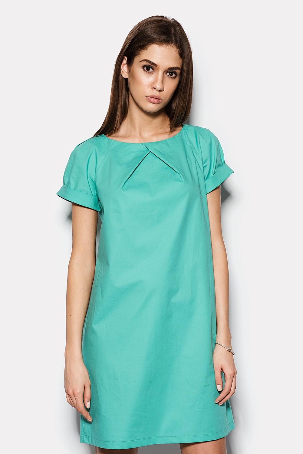 Платье, которое не будет плотно прилегать к коже, но подчеркнет твою красоту, - это платье ESTA. Ментоловый цвет хлопкового материала несет дополнительную прохладу этой натуральной ткани. Короткие рукава платья идут с манжетами и слегка приподняты на плечах. На передней части платья есть две диагональные складки, которые хорошо выделяют грудь, делая ее немного больше на вид. По центру спинки расположена застежка - пуговка над вырезом в форме капли. Выбери любимую пару обуви черного или бежевого цвета, и она обязательно подойдет под этот ансамбль.
