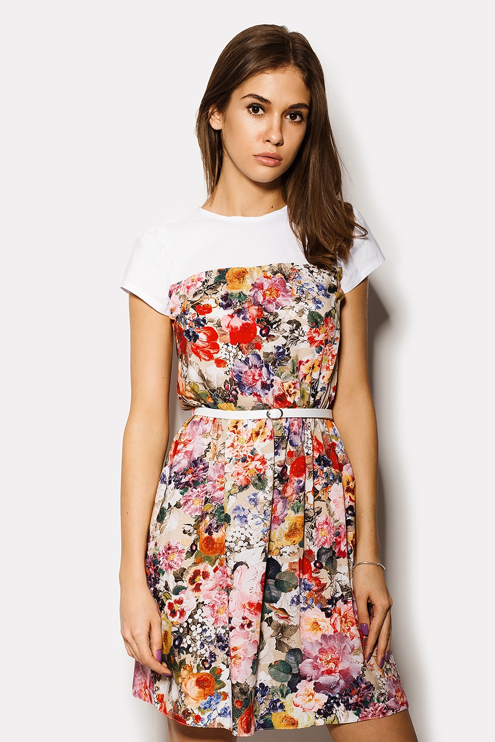 Каждый день лета мы начинаем, спрашивая себя: что надеть, чтобы было не так жарко. Высокая температура обязывает наших дизайнеров искать все новые и новые ткани и фасоны, чтобы ты чувствовала себя комфортно. Штапельная основа платья KLIO с цветочным рисунком, как и белоснежная кокетка из бенгалина, - правильный выбор материалов для летней одежды. Белый бенгалин распространяется не только на кокетку, но и на рукавчики платья. Дополнительным элементом платья служит белый пояс, который позволяет очертить фигуру и дополняет бенгалиновую кокетку.