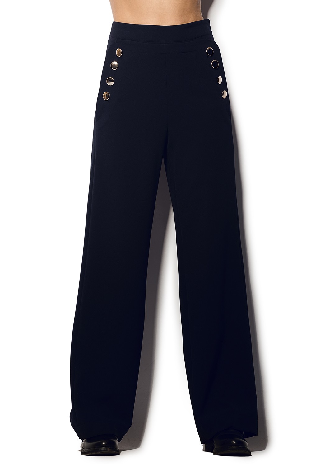 Oversize не оставляет в покое души дизайнеров, и с <<верха>> они переключились на <<низ>>. В этом году модным хитом станут широкие брюки разных фасонов, длины и расцветок. Брюки палаццо - новый тренд сезона представлен брендом CARDO в стильной модели "OTIS" dark blue. Палаццо - это фасон брюк, когда расклешение штанины начинается уже от верхней части бедра или талии. Модель изготовлена из классической брючно-костюмной ткани в сдержанном и элегантном темно-синем цвете. Великолепная модель широких брюк с высокой посадкой(по талии) выдержана в классическом стиле, без карманов. Декорирована крупными золотыми пуговицами. Застегивается на потайную молнию сбоку.