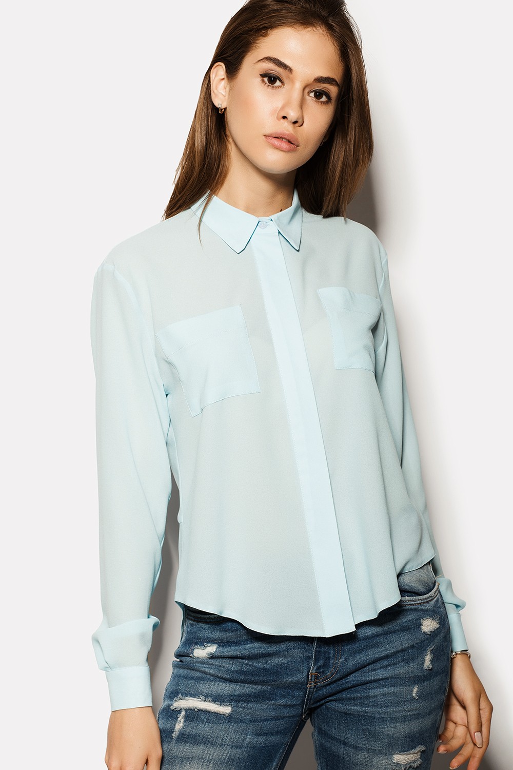 Голубая рубашка MITCHEL выполнена из полупрозрачной ткани креп-шифона. Аккуратный воротник стандартного размера возвышается над планкой, которая прикрывает пуговицы. Нагрудные карманы расположены по бокам от планки. Удлиненная спинка снизу разрезана посередине.