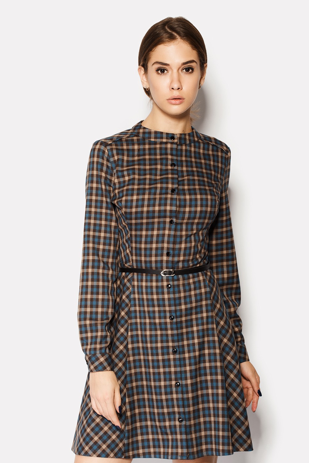 Платье в клетку (синий и беж) с узким черным пояском на талии - LIMBO. Платье застегивается спереди, т.к. пуговицы идут по планке на всю длину платья. Погоны-патики на плечиках и манжеты на рукавах добавляют платью особого колорита.