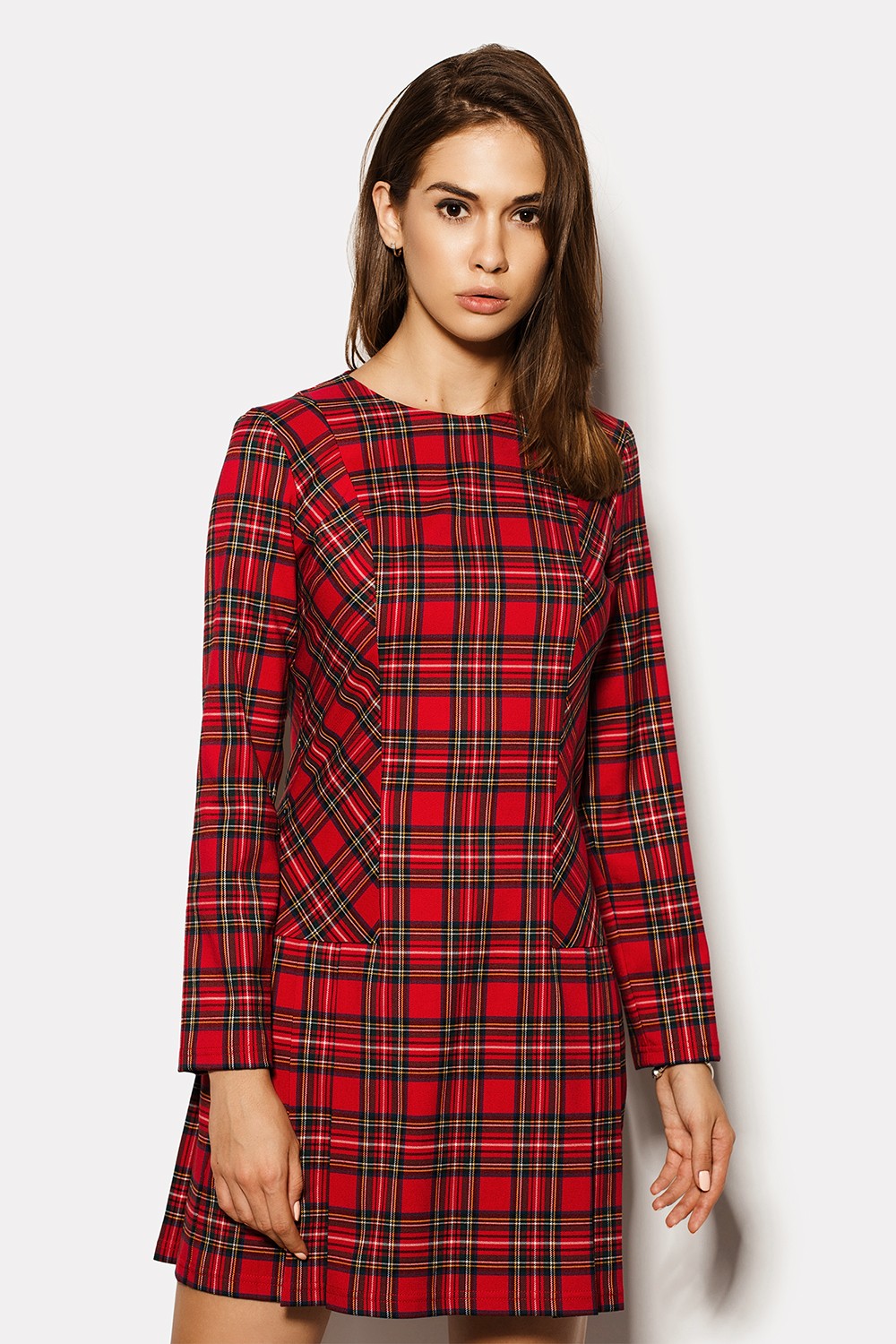 Короткое красное клетчатое платье REXTON шьется из костюмной ткани. По талии облегает, а на обрезной юбке становится пышнее за счет складок по бокам. Рукав у платья прямой, полноценный. Молния спрятана по центру спинки.