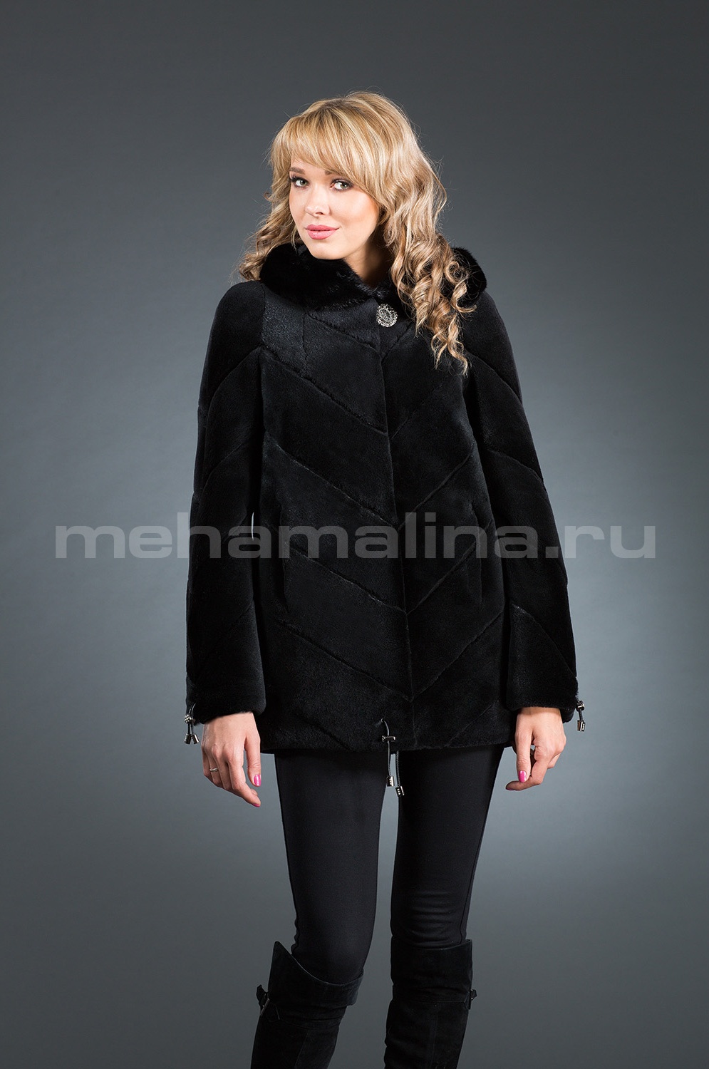 Шуба из стриженной нутрии, цвет черный. Капюшон оформлен норкой. Застежки - крючки. Производство Пятигорск.