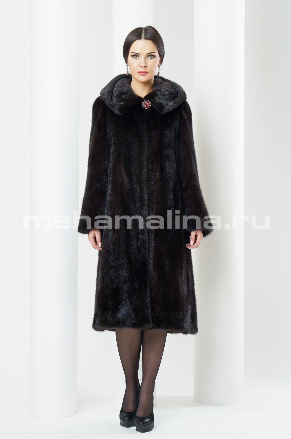 Шуба из норки, цвет махагон, с капюшоном. Длина изделия 110 см