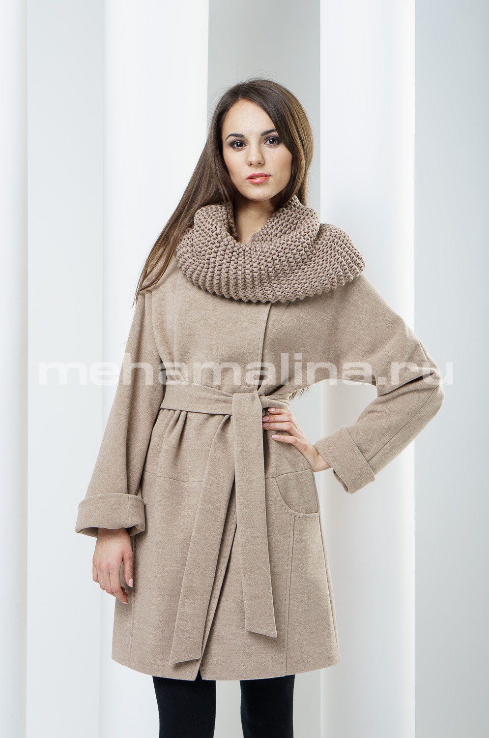 Пальто бежевого цвета, с декоративной строчкой, на кнопках, воротник стойка. Длина 90 см. Производитель Россия.