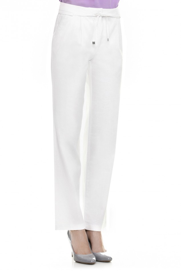 Идеальный вариант для повседневного ношения в жаркое время года. Эти брюки позволят Вам создать подчеркнуто элегантный образ. Модель выполнена из смесового льна, который отличается прочностью, гигроскопичностью и способность дарить охлаждающий эффект. Брюки застегиваются на молнию, пояс - на потайной крючок. Посадку изделия по фигуре Вы сможете регулировать при помощи утягивающей кулиски со шнуром. По бокам два кармана, сзади два ложных кармана. На бедрах заложены небольшие складки. Брюки имеют прямой крой.