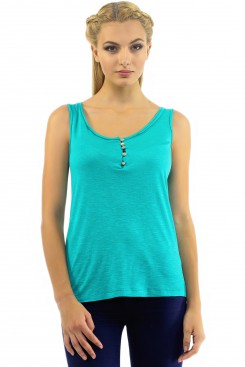 Майка, выполненная из мягкого и легкого вискозного трикотажа, поможет Вам выглядеть ярко и стильно в жаркую погоду. Передняя часть изделия украшена застежкой-хенли с пуговицами цвета "металлик". Эта модель превосходно подходит для похода на пляж, отдыха и развлечений.