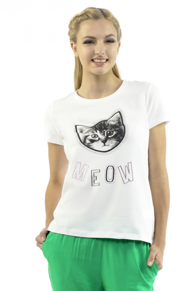 Футболка из плотного хлопкового трикотажа с добавлением эластана подарит Вам удобство и комфорт. Любите кошек? Тогда Вам несомненно придется по душе принт, которым украшено изделие. Рисунок дополнительно декорирован разноцветными стразами.