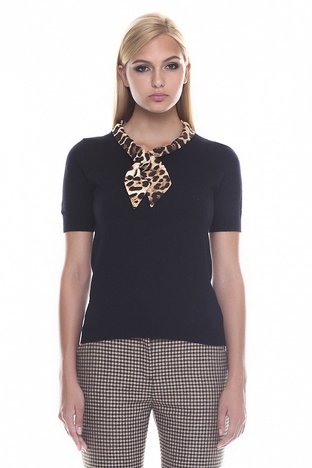 Стильный джемпер с воротником-аскот добавит Вашему облику шика элегантности. Модель выполнена из трикотажа с добавлением ангоры, благодаря чему отличается мягкостью и способностью удерживать тепло. Воротник выполнен из крепдешина, украшенного модным леопардовым принтом