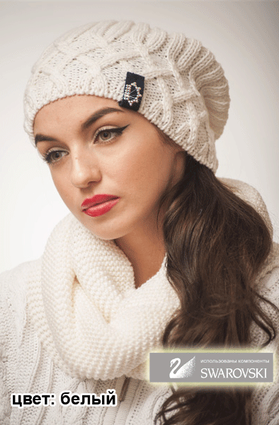 Современная удлиненная шапка объемной вязки <<ромбы>> на межсезонье. Такие модели обладают антивозрастным эффектом, делая ваш образ расслабленным и по - молодежному стильным. Съемное украшение с логотипом выполнено с использованием кристаллов Swarovski и добавляет образу элемент шика.