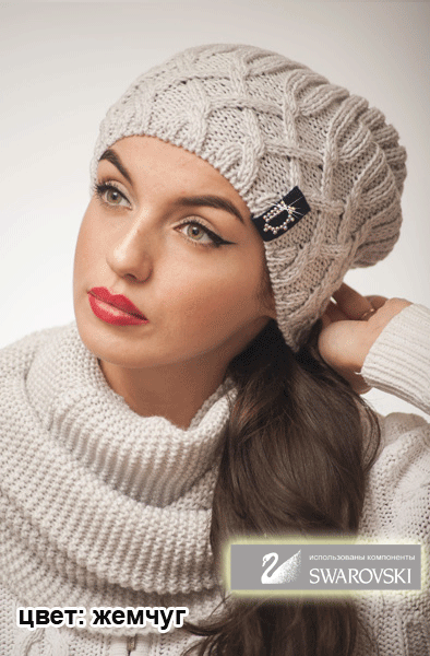 Современная удлиненная шапка объемной вязки <<ромбы>> на межсезонье. Такие модели обладают антивозрастным эффектом, делая ваш образ расслабленным и по - молодежному стильным. Съемное украшение с логотипом выполнено с использованием кристаллов Swarovski и добавляет образу элемент шика.