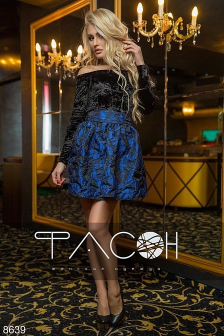Приталенное платье из комбинированных материалов: верх бархат, низ жаккарж-тафта. Юбка в сборку на талии. Пояс в комплекте.