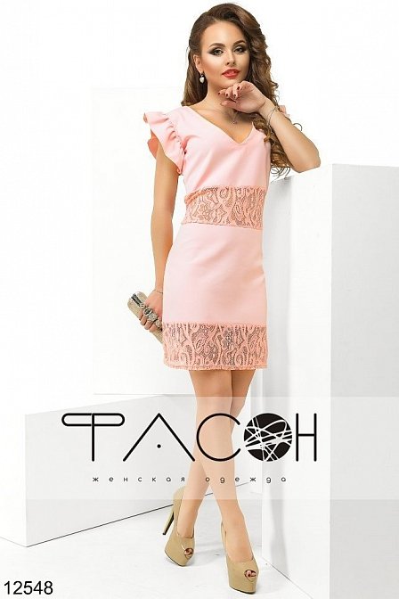 Элегантное платье прилегающего силуэта с V-образным вырезом в зоне декольте, декорированное рюшами и вставками из гипюра. Сзади потайная молния.