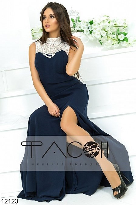 Элегантное вечернее платье прилегающего силуэта с глубоким разрезом, декорированное оригинальной вставкой из гипюра со съемным металлическим украшением. Юбка клешеная. Сзади вырез капелька (застегивается на три пуговицы) и потайная молния.