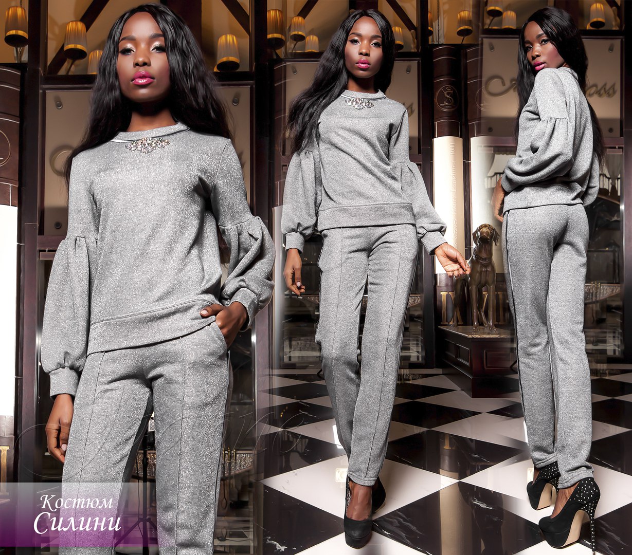 Женский прогулочный костюм VIP из люрексной ткани: свитшот с аккуратным силуэтом, горловина обыграна дорогим шелком с шикарной брошью с огромными камнями. Изюминку в себе несут шикарные рукава, дополняет красоту образа и вытягивает ноги лампасы из нежного шелка. Придает богатый и шикарный вид костюму очень красивая ткань, из которой выполнено изделие.