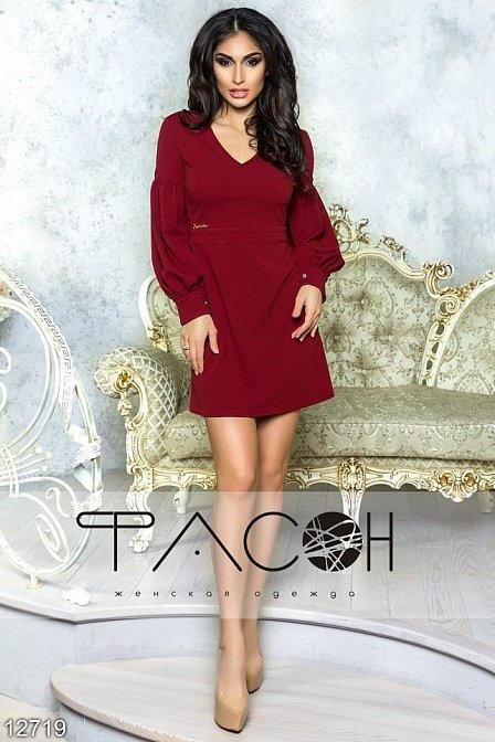 Элегантное платье прилегающего силуэта с рукавами-фонариками, декорированное металлической нашивкой сбоку. На груди V-образный вырез. Сзади потайная молния.