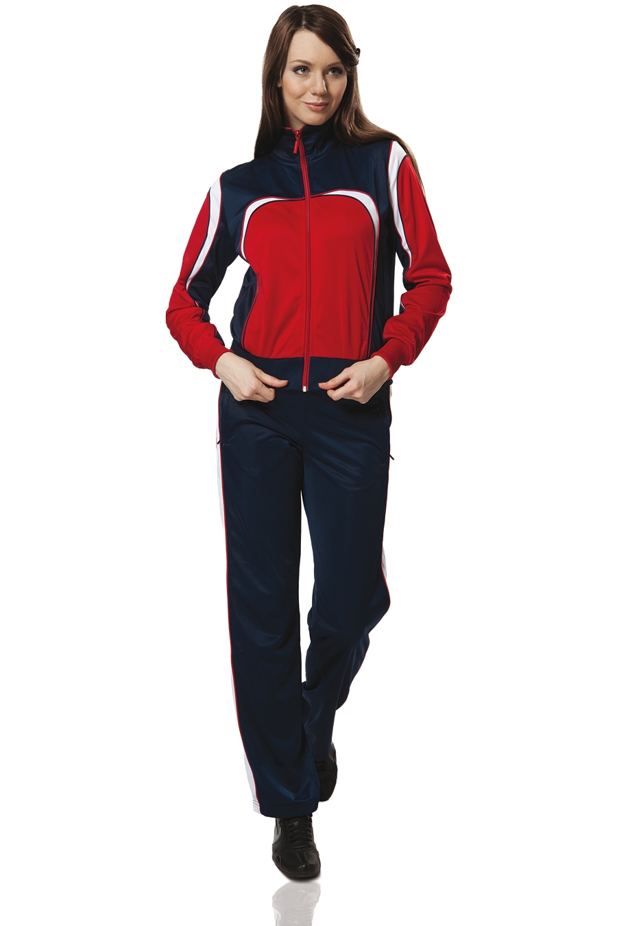 Брюки с боковой вставкой, оформленной контрастным кантом с обеих сторон, с боковыми карманами на молнии. Пояс с эластичной тесьмой, регулируемый шнуром.